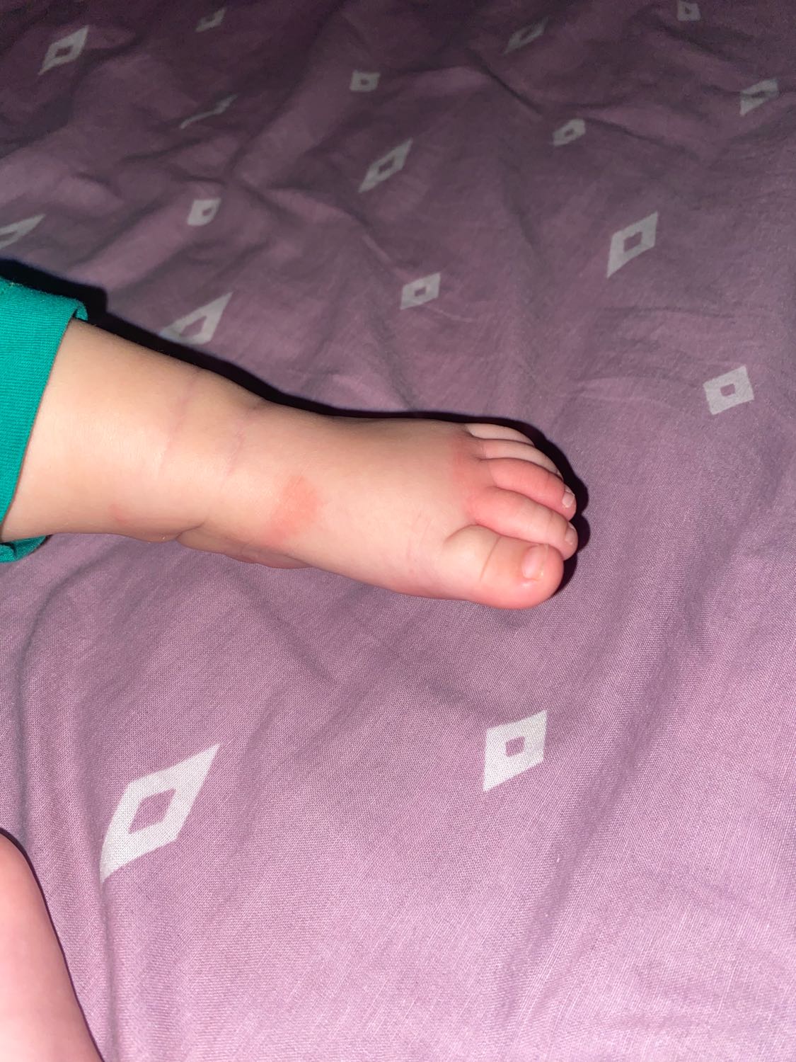 Всем привет. У малышки опух средний палец и красные пятна на левой ноге. Что это может быть? Заметила сегодня под вечер..