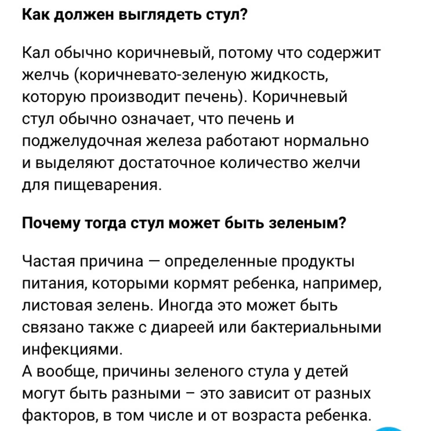 У нас был зелёный на смеси Комфорт, по анализам все было в норме, у младенцев не сформирован ЖКТ, не заселена флора и это нормально. Когда подрос, к 3 месяцам перешли от комфорта на обычную смесь и стул сменился на желтый.